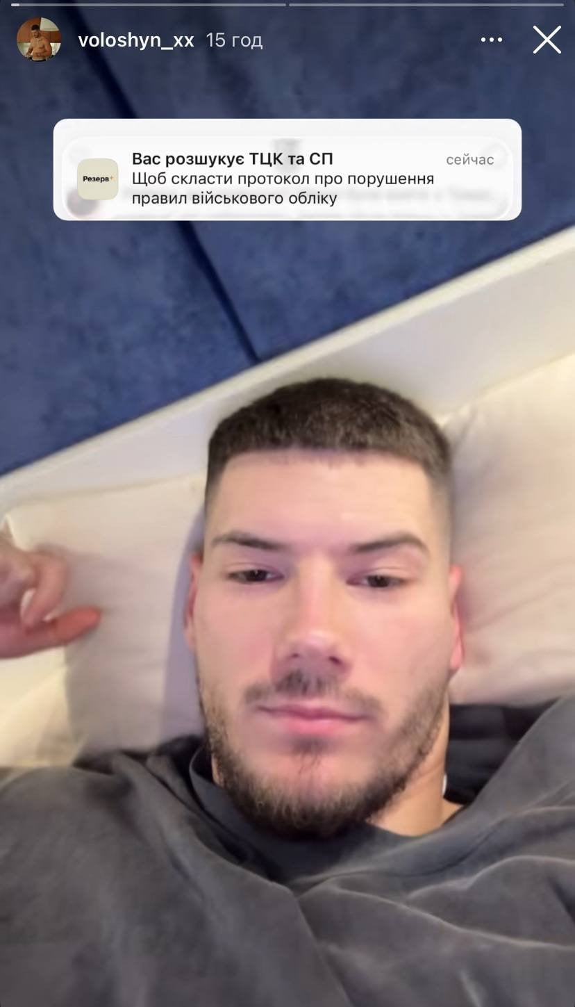 Про це він повідомив в Instagram-stories. Зокрема, блогер показав відповідне повідомлення з “Резерв+” – застосунки для призовників, військовозобов’язаних та резервістів. Там йшлося про те, що Олександра Волошина розшукує територіальний центр комплектування та соціальної підтримки. Причина – порушення правил військового обліку.