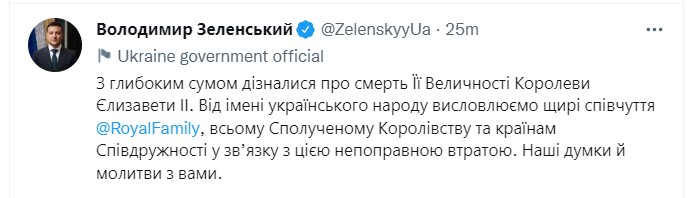 “З глибоким сумом дізналися про смерть Її Величності королеви Єлизавети II. Від імені українського народу висловлюємо щирі співчуття королівській родині, всьому Сполученому Королівству та країнам Співдружності у зв’язку з цією непоправною втратою. Наші думки та молитви з вами”, – написав він у Twitter.