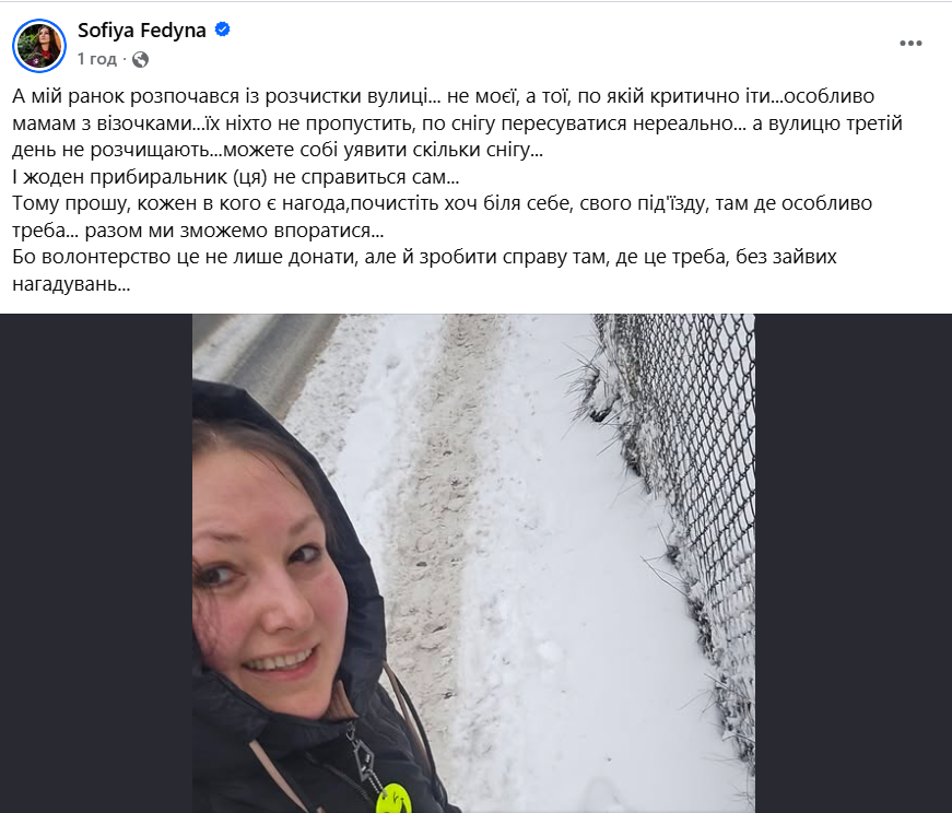Народна депутатка від «Європейської солідарності» Софія Федина закликала громадян долучитися до прибирання вулиць від снігу.