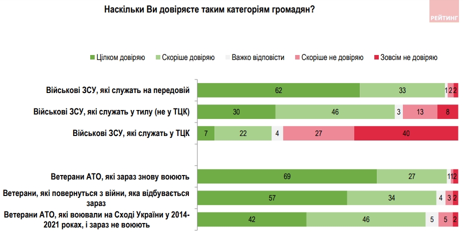 У категорії військових 94% довіряють військовим ЗСУ, які служать на передовій, 76% довірять тим, хто служить у тилу (не ТЦК).